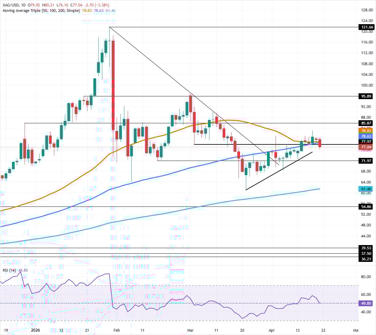 白银走势转為看跌,价格跌破77.79美元的100日简单移动均缐(SMA)并跌破自3月23日低点起画的支撑趋势缐,加剧了最初向74.72美元20日简单移动均缐(SMA)下跌的趋势。