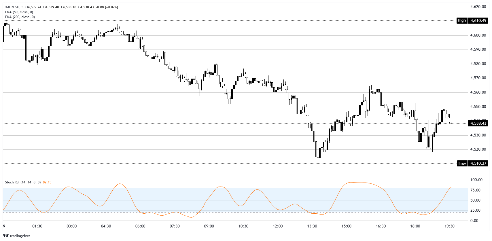 黄金/美元周三下跌约1.6%,从接近4610的盘中高点跌至约4510的盘中低点,随后在FOMC决议公布后反弹至约4565,在鲍威尔新闻发布会期间回升,随后再次回落至4520区域附近,目前交投于4534附近。盘中走势显示在利率决议前形成一系列稳步走低的高点和低点,晚盘价格走势在4520至4560区间内形成初步筑底形态,鲍威尔讲话后的反弹随后让位于第二波抛售。